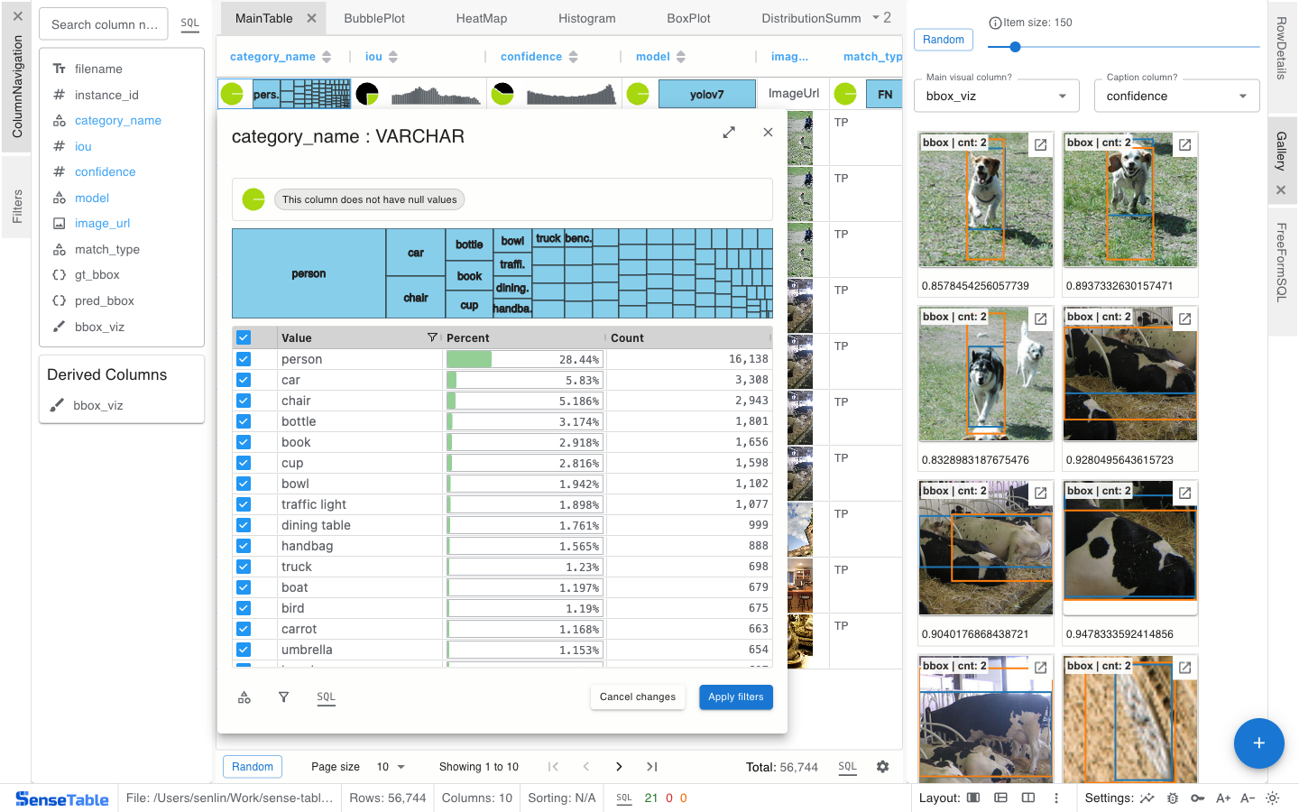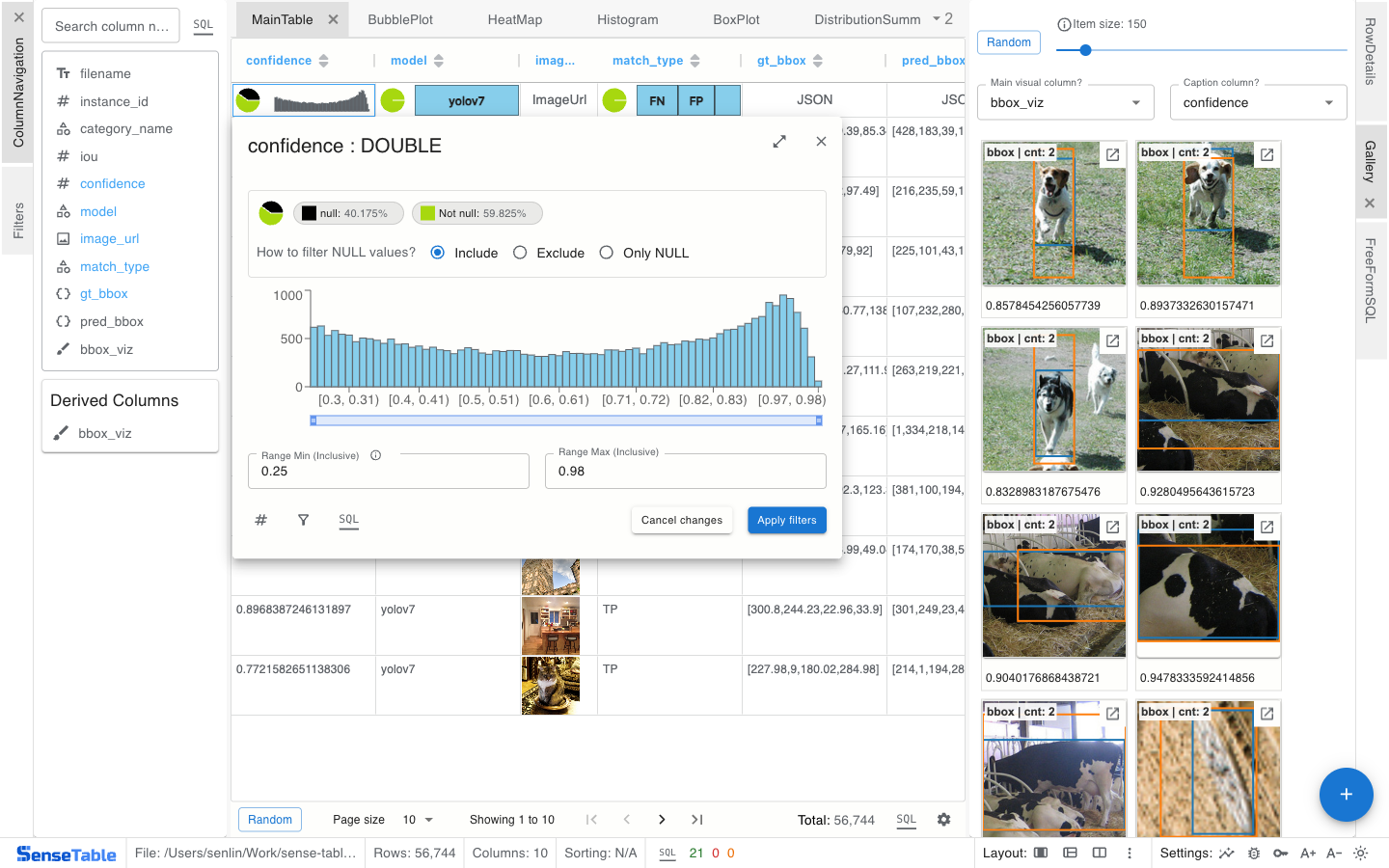 - Main Table (center panel): Displays the data table with column distribution plots embedded in the header, providing immediate visual insights.
